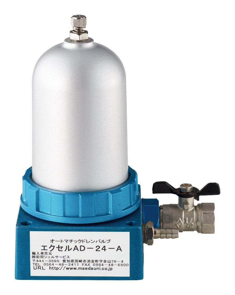オートマチックドレン排出バルブ ”エクセルAD-24-A”は、コンプレッサー、レシーバータンク等のドレンを自動で排出できる装置です。 ①電源が不要 コンプレッサーエアーの圧力だけで作動するため電源不要! ②設置が簡単 軽量小型・省スペースで設置場所を選びません! ドレンの排出口とウレタンホースをつなぐだけ。誰でも簡単に設置できます。