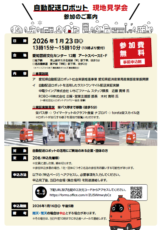 併せて、自動配送ロボットの活用可能性を知っていただくため、1月23日(金)に見学会を開催します。自動配送ロボットの活用に御興味・御関心のある小売事業者や物流事業者の皆様など、多くの方の御参加をお待ちしております。
